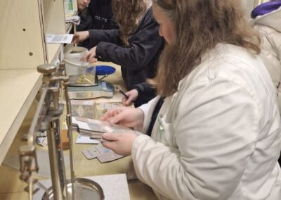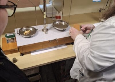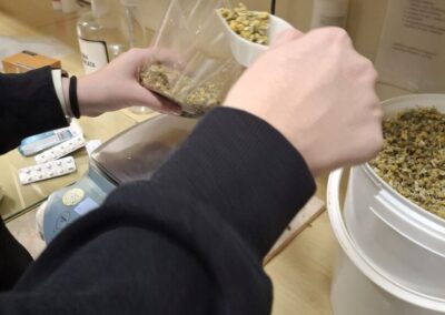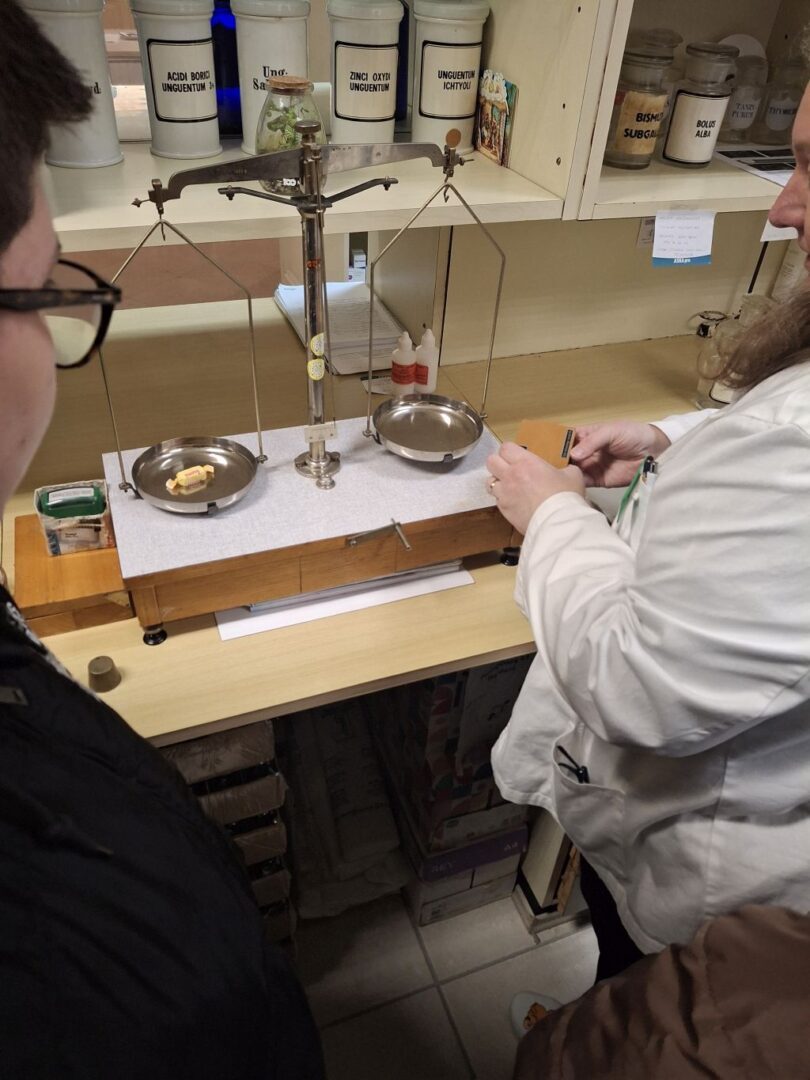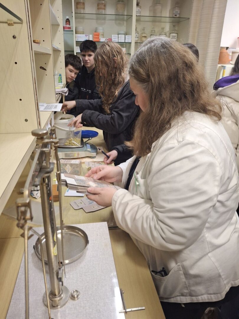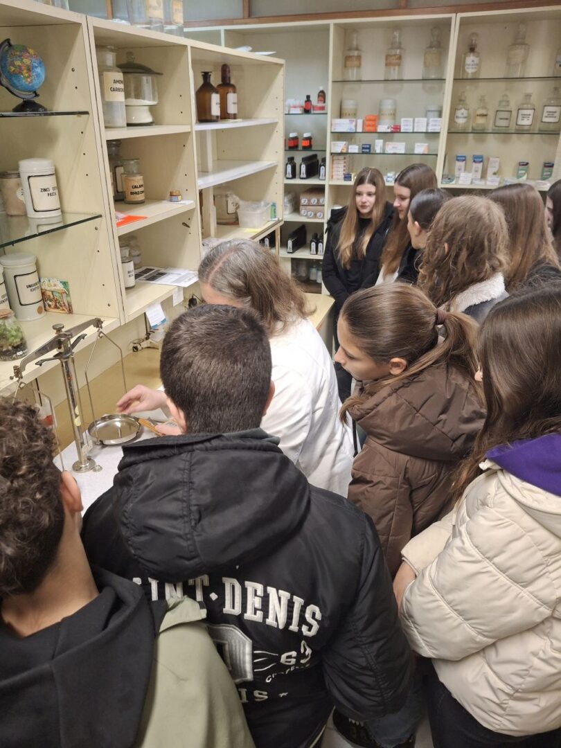 U ljekarni ih je srdačno dočekala gospođa Ivona koja je pripremila aktivnosti za učenike, a povezane su s nastavom fizike i kemije. Učenici su imali priliku mjeriti male mase što je iznimno važno u samoj proizvodnji ljekova, te su pakirali vrećice domaćeg čaja kamilice kojeg su prethodno vagali. Učenici su vidjeli kako ljekarna funkcionira s “druge strane” koju mi kao kupci ne vidimo.